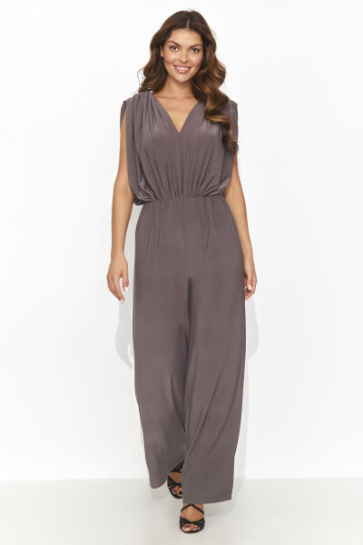 Az elegáns női overall hat kivételesen időtlen színben kapható: teve, világos bézs, babarózsaszín, fekete, mokka, csokoládé. A laza szabás kényelmet és könnyű viseletet biztosít. Vállmagasságban elegáns redőkkel rendelkezik. A mélyülő nyakkivágás nem csak a mellbőséget emeli ki, hanem optikailag meghosszabbítja a nyakat is, így finom eleganciát ad. A hosszú és széles nadrág időtlen divatmegoldás, amely jól passzol a különböző lábbeliekhez. A jumpsuit csúszós és rendkívül kellemes tapintású anyagból készült, ami igazán élvezetté teszi viselését. Ideális választás azoknak a nőknek, akik értékelik a klasszikusokat és a kényelmet egyben. Összetétel: 94% poliészter, 6% elasztán A megadott méretek laposra vannak mérve, az eltérés +/- 2 cm lehet.